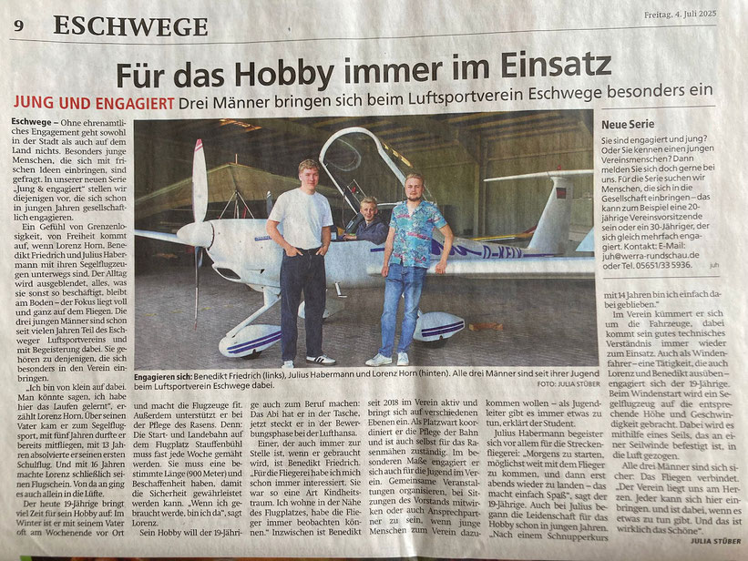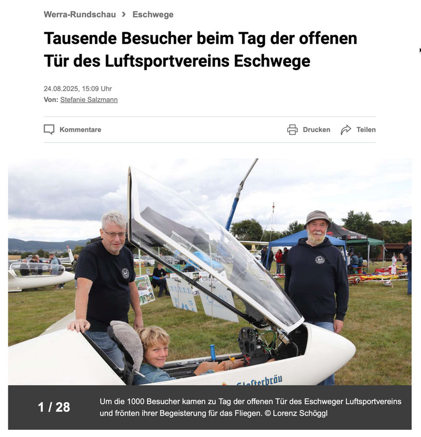 Der Tag der offenen Tür des Eschweger Luftsportvereins, der nach einer langen Pause von 7 Jahren am 23.08.2025 wieder veranstaltet wurde, war ein voller Erfolg. Nachdem das Wetter gegen Mittag endlich aufklarte, fanden viele Besucher den Weg auf den Stauffenbühl und bekamen ein abwechslungsreiches Programm und viele Attraktionen geboten. Einen kleinen Einblick gibt die Fotostrecke der Werra-Rundschau.